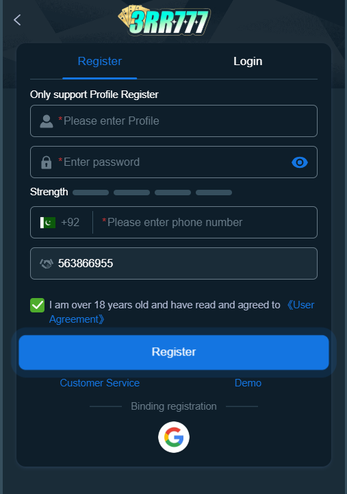 Creating an account on the 3RR777 is simple and quick: